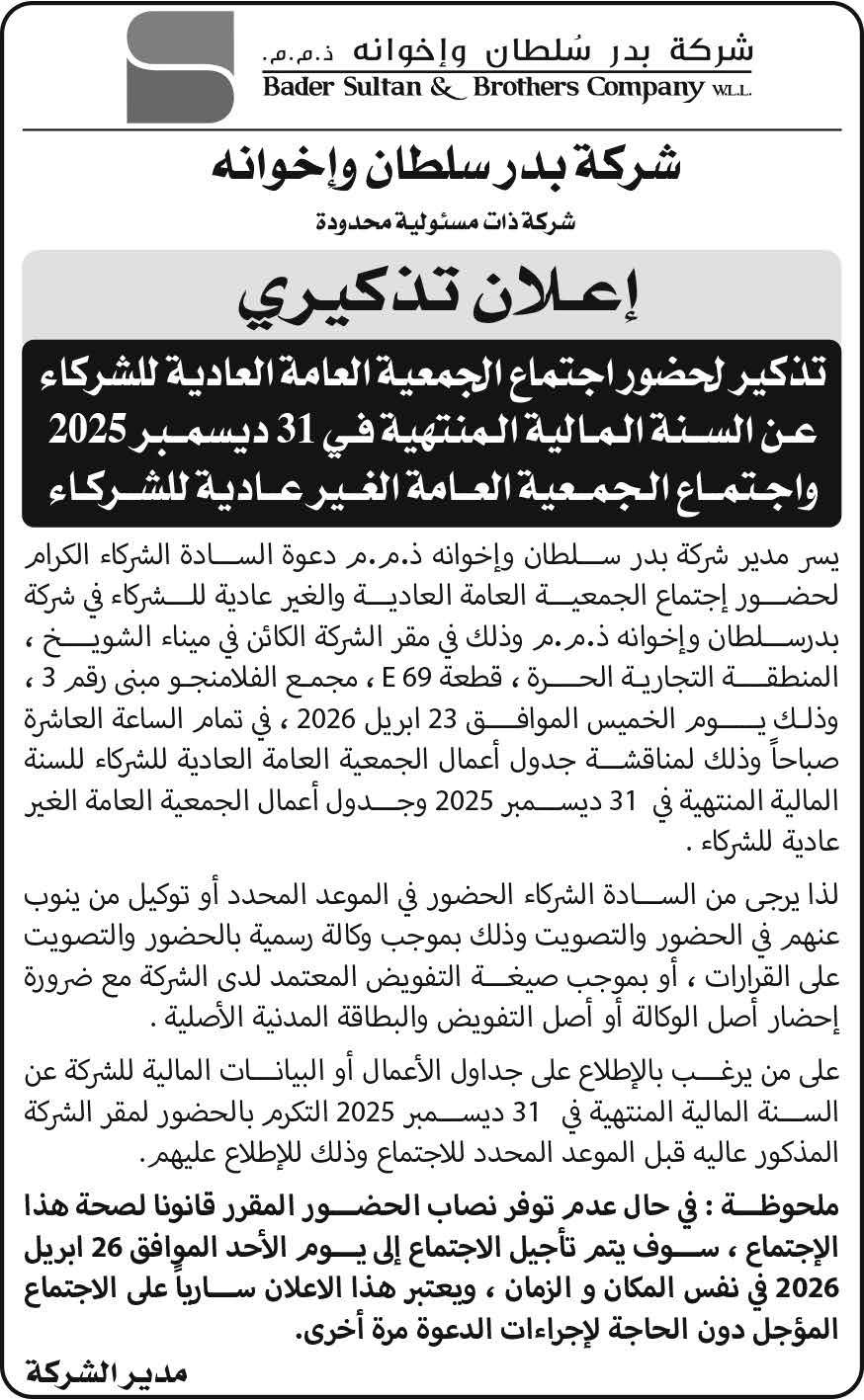 إعلان لحضور إجتماع الجمعية العامة العادية والغير عادية لشركة بدر سلطان وإخوانه ذ.م.م المُزمع إنعقاده بتاريخ 23 ابريل 2026