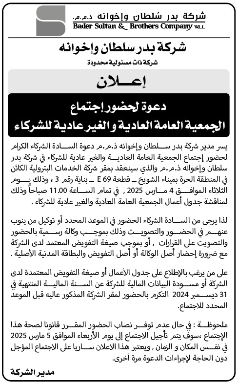 إعلان الجمعية العامة العادية والغير عادية لشركة بدر سلطان وإخوانه ذ.م.م المُزمع إنعقاده بتاريخ 26 مايو 2025