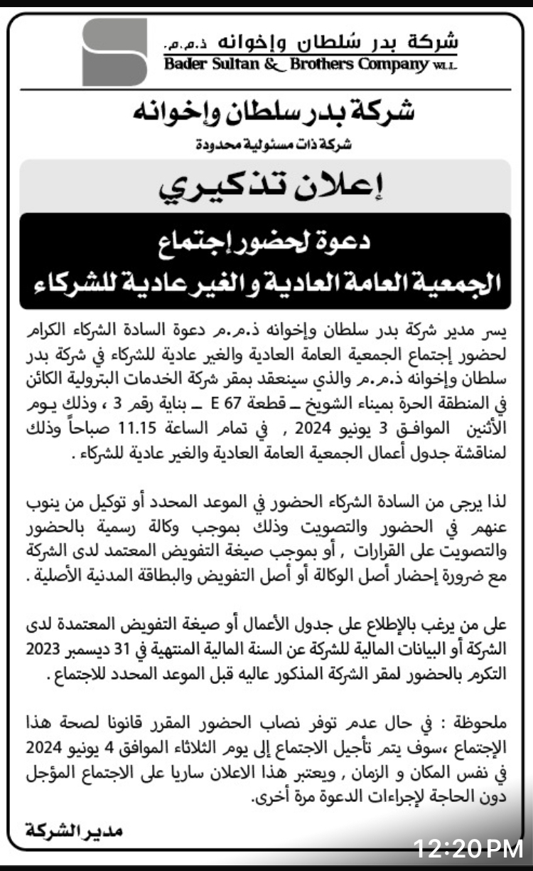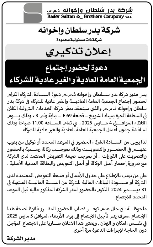 إعلان تذكيري لحضور إجتماع الجمعية العامة العادية والغير عادية لشركة بدر سلطان وإخوانه ذ.م.م المُزمع إنعقاده بتاريخ 26 مايو 20255