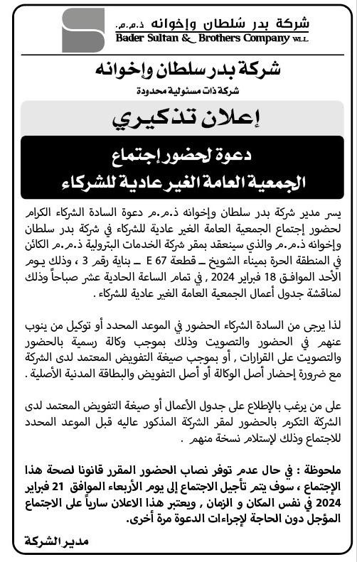 إعلان لحضور إجتماع الجمعية العامة الغير عادية للشركاء الذي سينعقد يوم 18 فبراير 2024