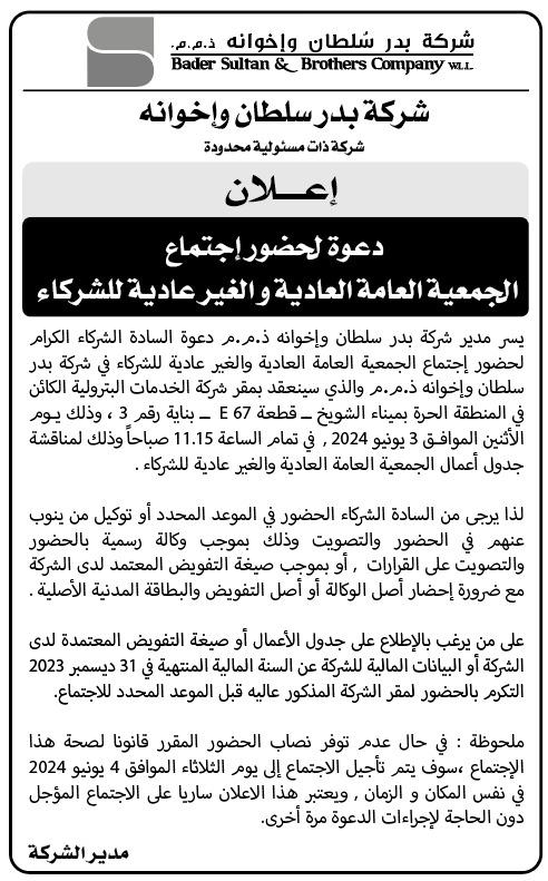 إعلان الجمعية العامة العادية والغير عادية لشركة بدر سلطان وإخوانه المُزمع إنعقاده بتاريخ 3 يونيو 2024