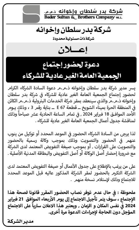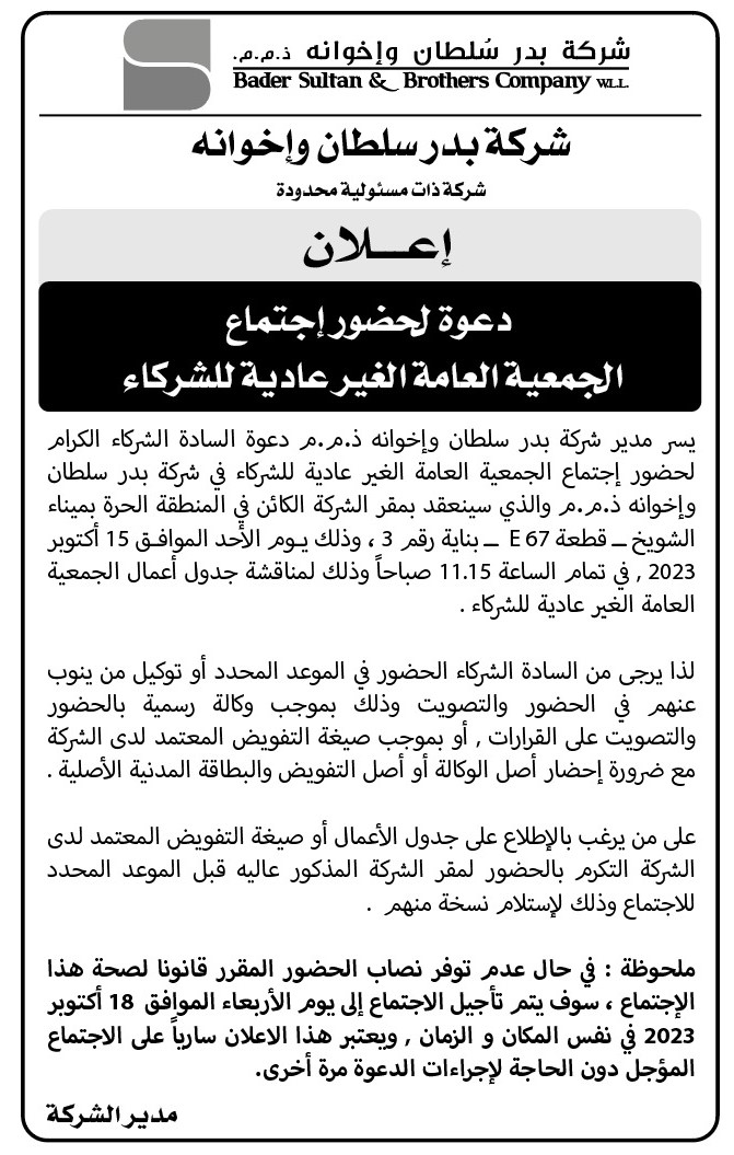 إعلان الجمعية العامة العادية والغير عادية لشركة بدر سلطان وإخوانه ذ.م.م المُزمع إنعقاده بتاريخ 26 مايو 2025