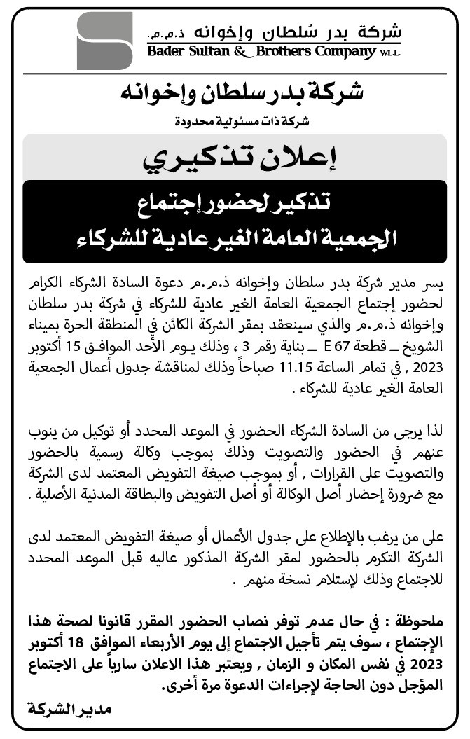 إعلان تذكيري لحضور إجتماع الجمعية العامة العادية والغير عادية لشركة بدر سلطان وإخوانه ذ.م.م المُزمع إنعقاده بتاريخ 26 مايو 20255